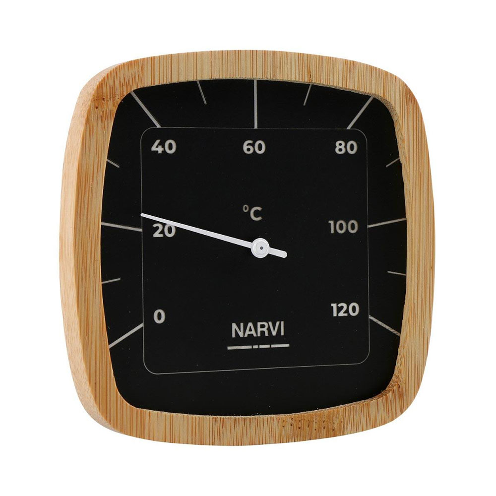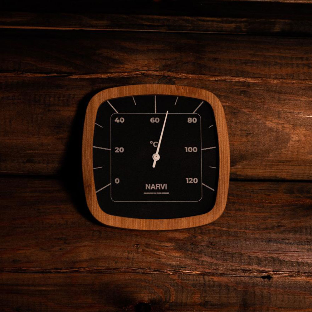Narvi Black termometeret er et stilfuldt saunatilbehør lavet af sort aluminium og en birkeramme. Passer godt sammen med Narvi Black spand og øse.