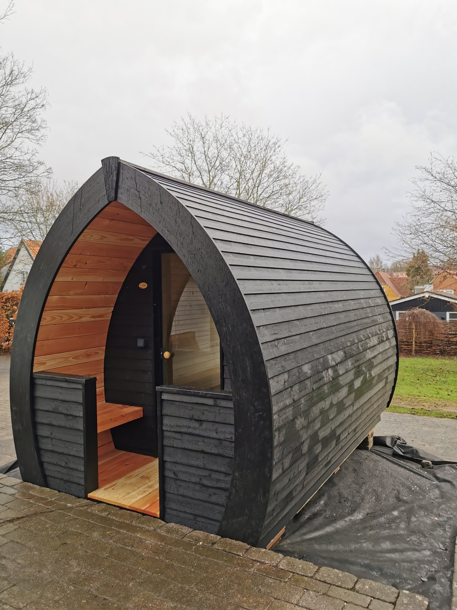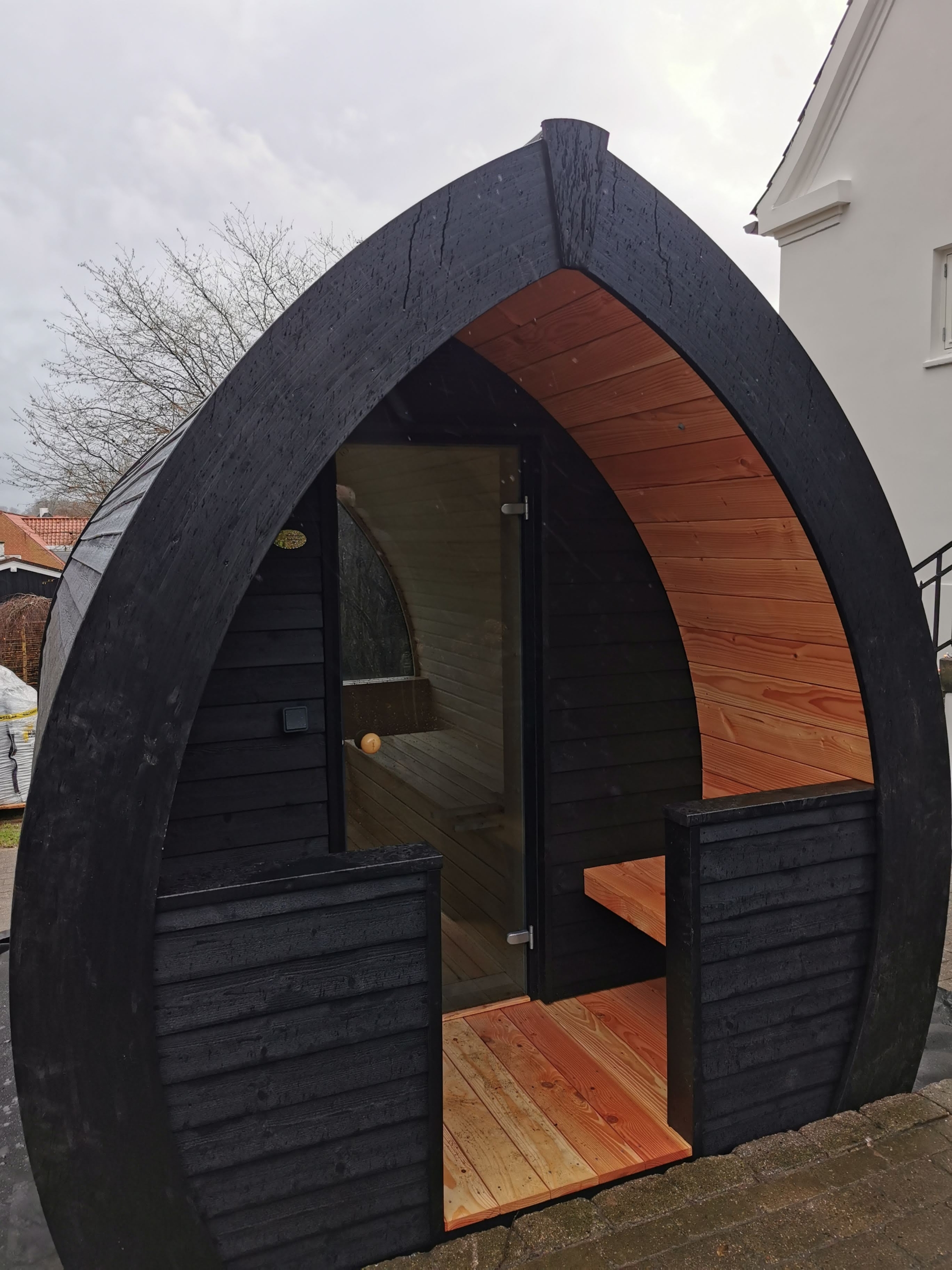 Saunaen er beklædt med 25 x 125 mm sortmalet klinkebeklædning. På toppen er der sort tagpap med indfarvet inddækning i gavlenderne. Det store vindue i gavlen er 2 x 1.40 meter og døren er 0,70 x 1.90 meter med lås.