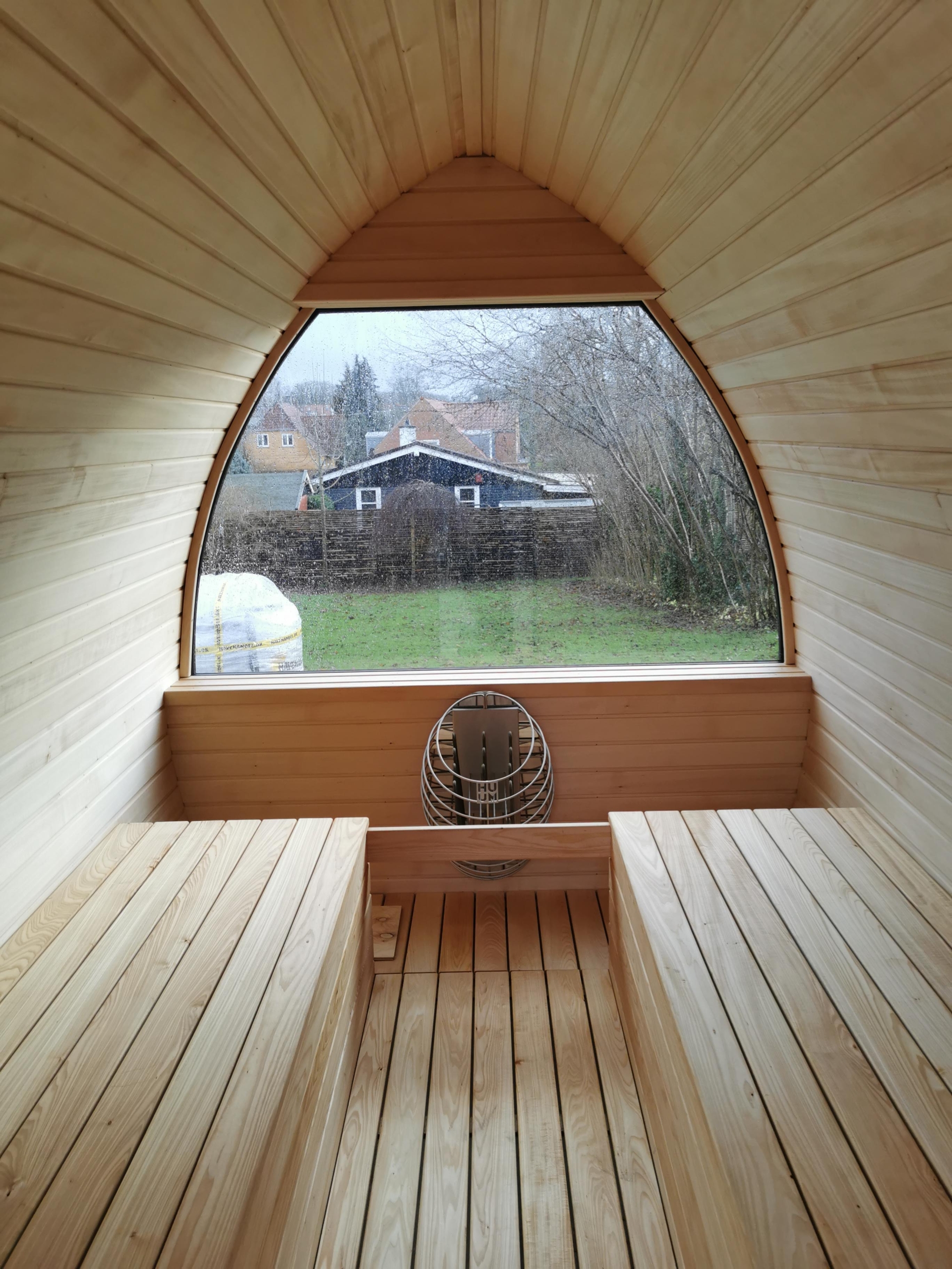 Saunaen består af et stort rum med en bænk i hver side. I gavlen har saunaen et stort lækkert vindue. Bonus ved denne sauna er, at de to bænke har en bredde på hele 70 centimeter, så saunaen kan også bruges til ekstra sovepladser i haven.