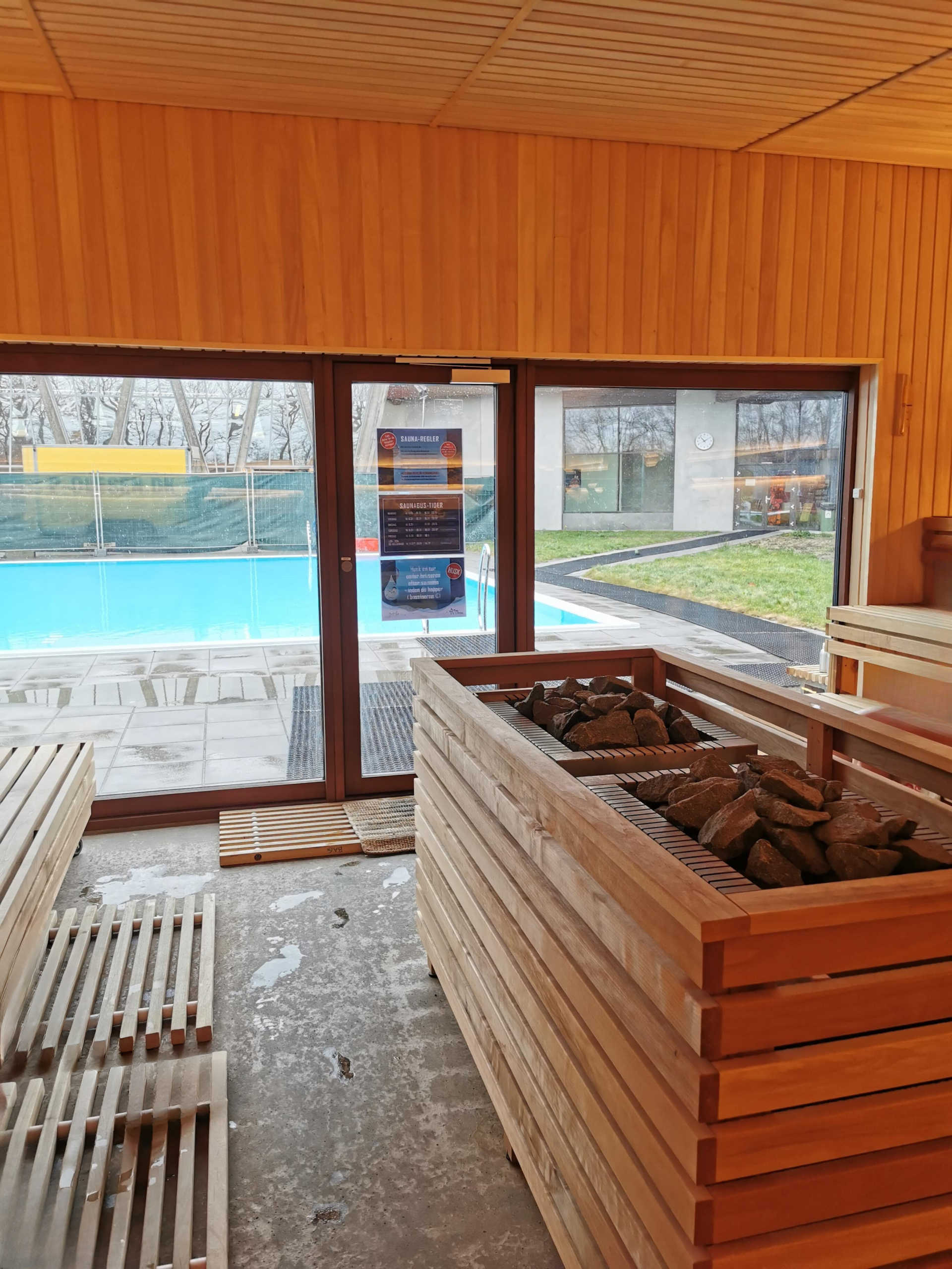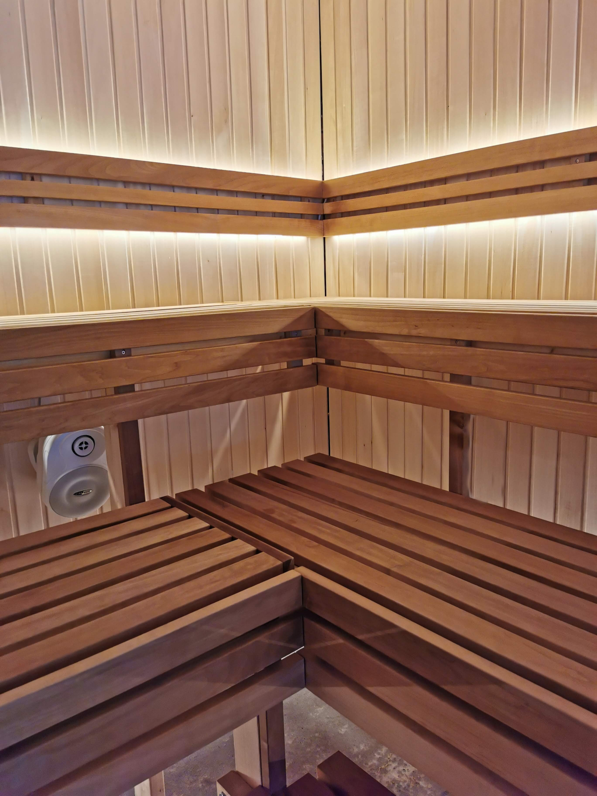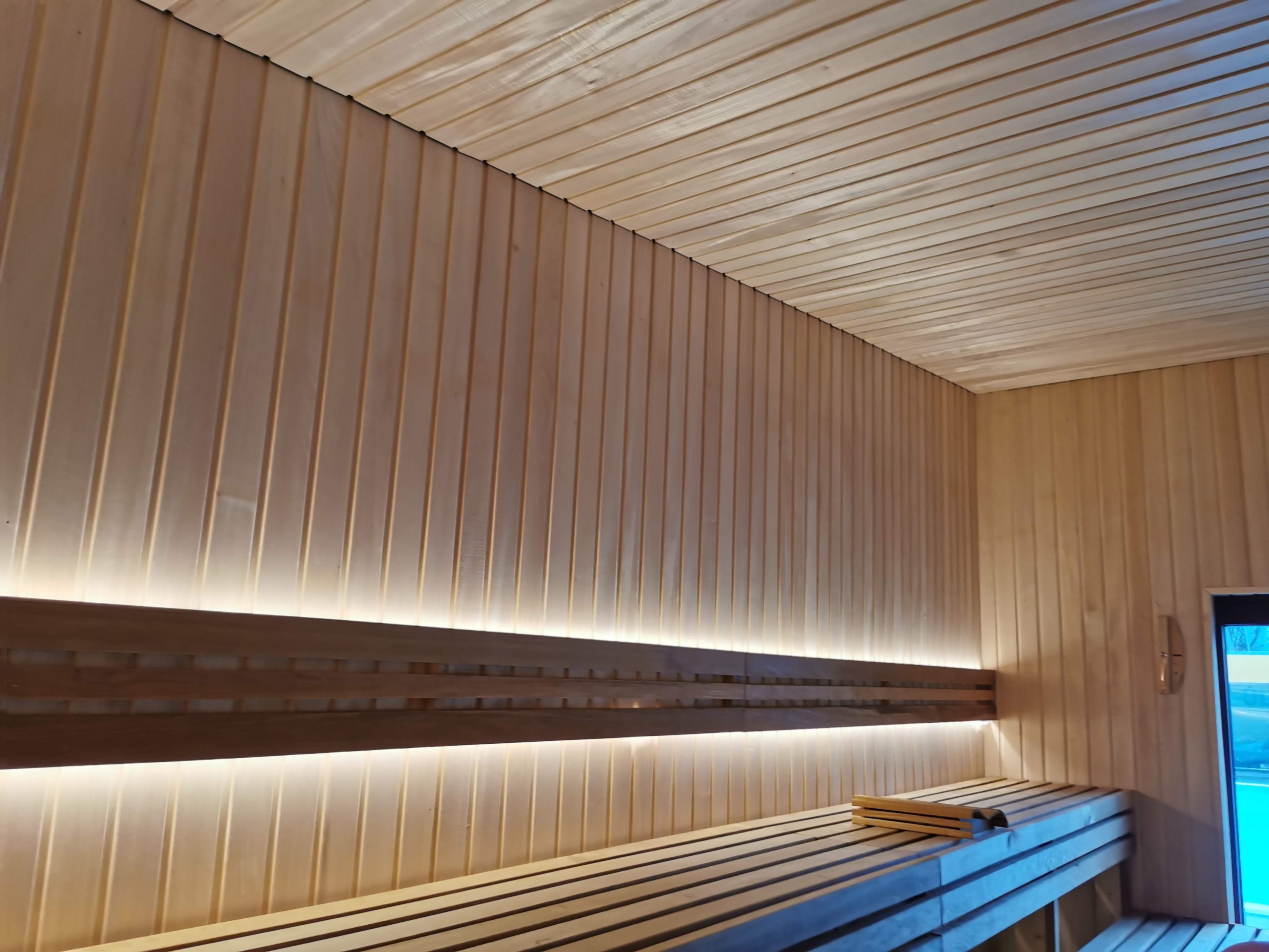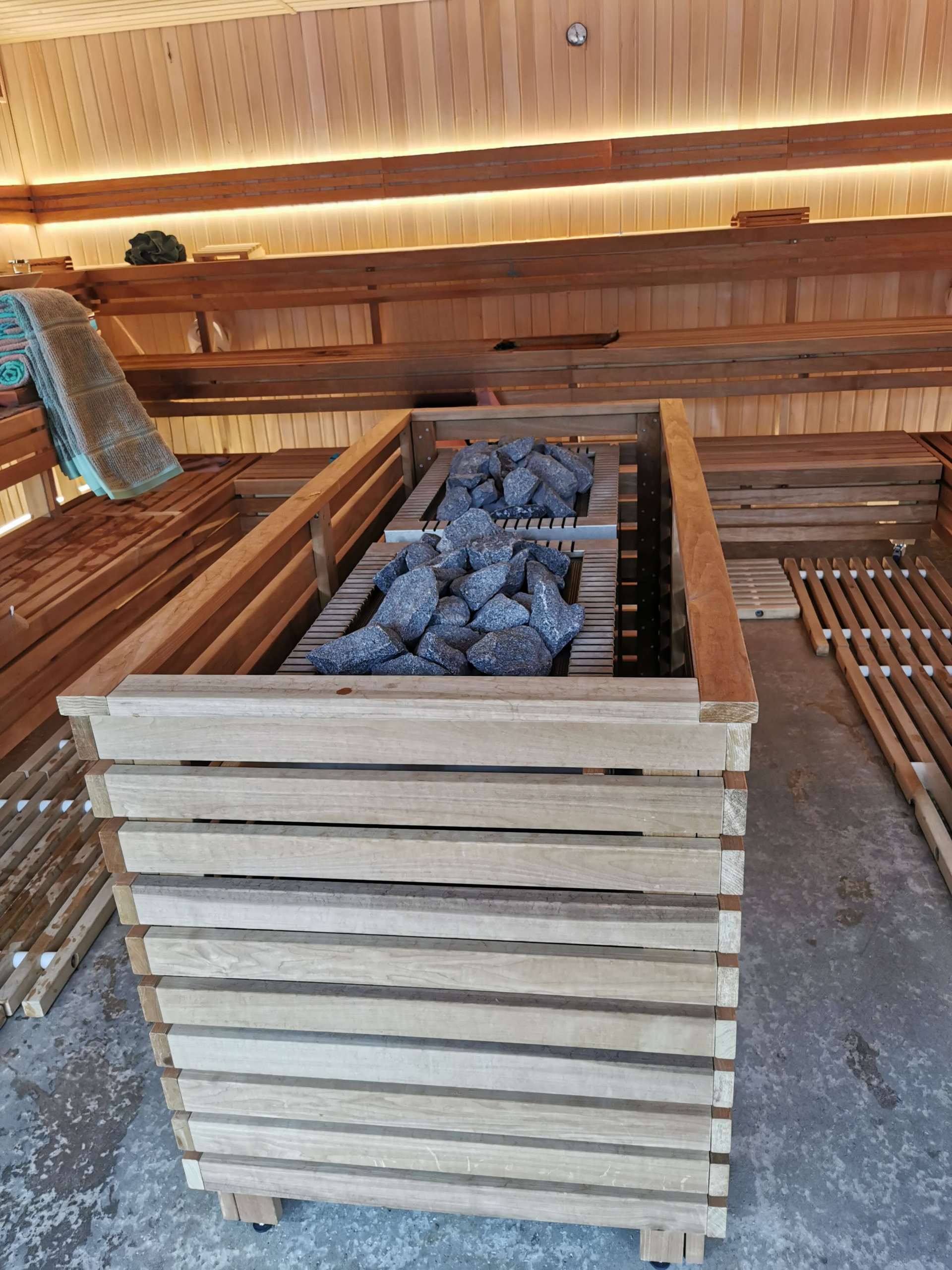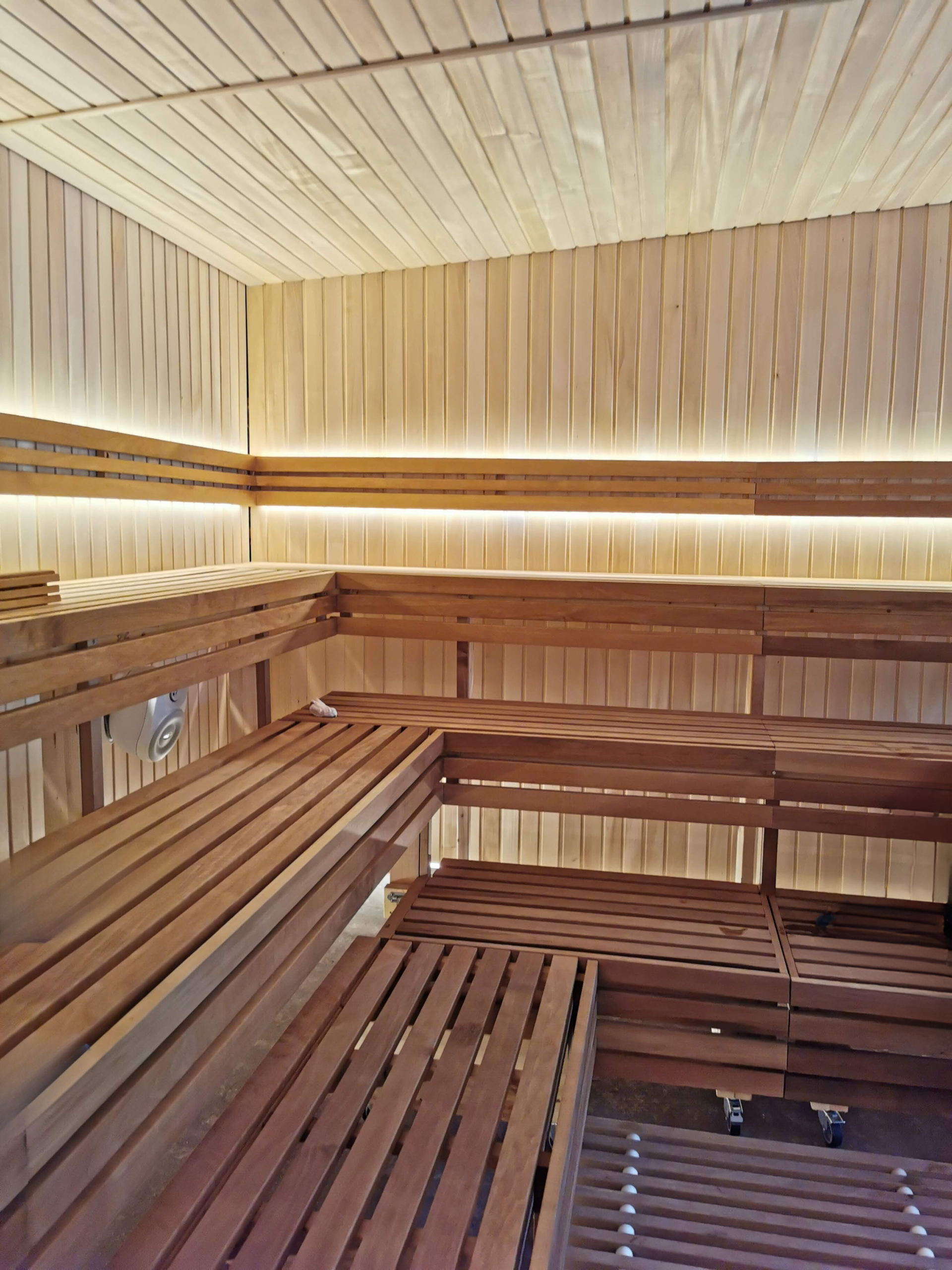 Vi har også leveret saunamaterialer til projektet, og designet er en smuk kombination af to forskellige trætyper: lys asp på loft og vægge og termoaspen til bænke. Termoasp er meget slidstærkt og har lang levetid. Vi har også leveret to professionelle saunaovne til projektet.
